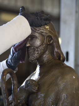 Patina - chemicals applied to heated surface to achieve various colors requested by sculptor.